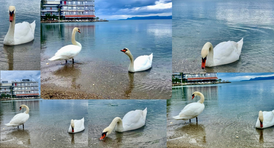 Ψιλοί και εντυπωσιακοί κύκνοι κάνανε βουτιές στην θάλασσα και πολλές βόλτες στην αμμουδιά.