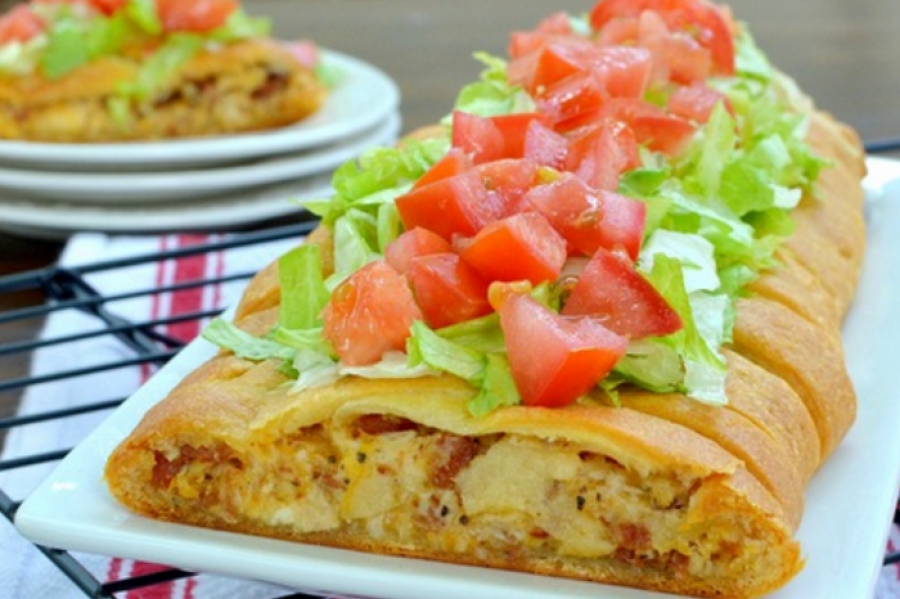 4. Στρώνετε κατά μήκος, στο κέντρο της ζύμης το μείγμα κοτόπουλου, αφήνοντας περιθώριο επάνω και κάτω 3 εκ. περίπου για να διπλώνεται. Αρχίζετε να σκεπάζετε τη γέμιση με μια μια εναλλάξ τις λωρίδες, λοξά τη μία πάνω στην άλλη ώστε να δημιουργήσετε μια “πλεξίδα”. . Εναλλακτικά, σκεπάζετε το μείγμα, με το φύλλο κρουασάν ώς έχει, χωρίς πλεξίδα, γυρίζοντας τα περιθώρια ζύμης επάνω κάτω και το υπόλοιπο φύλλο από αριστερά και δεξιά και τα σφραγίζετε πατώντας με τα χέρια σας.