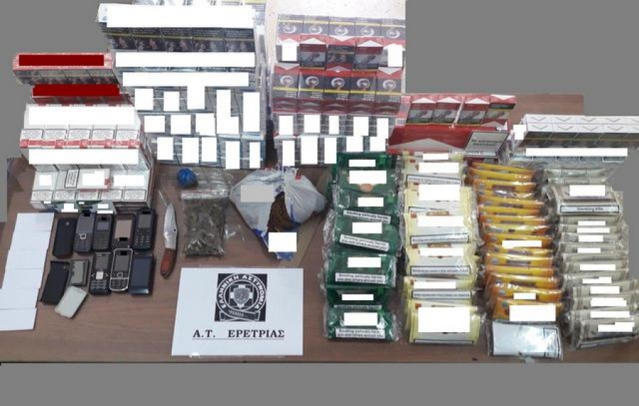 Τρία κιλά και 926 γραμμάρια αδασμολόγητου καπνού, 453 πακέτα τσιγάρων, διαφόρων μαρκών, τα οποία δεν έφεραν την ειδική ταινία φόρου κατανάλωσης, δύο αυτοσχέδιες νάιλον συσκευασίες, που περιείχαν ποσότητες ακατέργαστης κάνναβης, συνολικού μεικτού βάρους 14,5 γραμμαρίων, ένα πτυσσόμενο μαχαίρι και επτά κινητά τηλέφωνα.